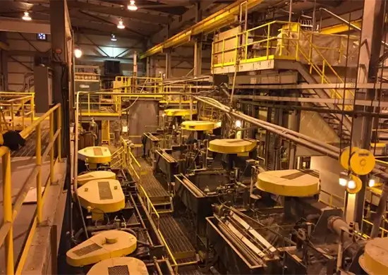 Ore from the underground mine is trucked via a spiral haulage way to surface and stored in the coarse ore shaft bin. The underground run of mine ore is sized through a jaw crusher and cone crusher, series of transfer conveyor belts and vibratory triple deck screen. The jaw crusher sizes the material to 3” (76 mm). The 3-foot (0.9 m) cone crusher then sizes the mill feed product to 5/8 inch (1.6 cm) or less and is directed to a fine ore bin. Four vibrating feeders located under the fine ore bin are used to feed the crushed ore at a controlled rate to the rod mill which is situated in the main mill building.